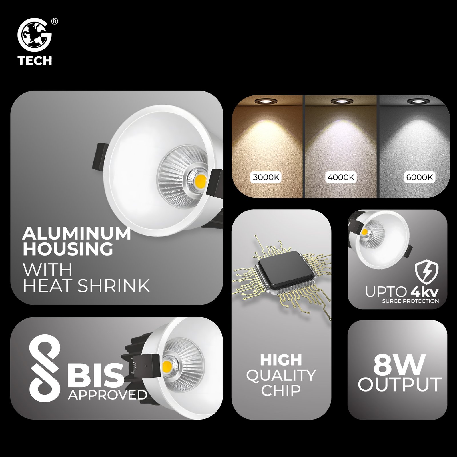 Illuminate your interiors with the G TECH Genius COB Downlight, designed to deliver intense, flicker-free brightness through advanced Chip-on-Board (COB) LED technology. This stylish, modern downlight features a refined alloy body, precision reflector, and optimal heat management—the ideal combination for lasting performance in homes, workspaces, retail showrooms, and hospitality venues.