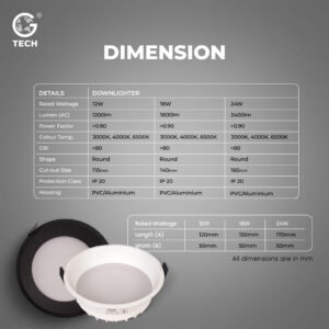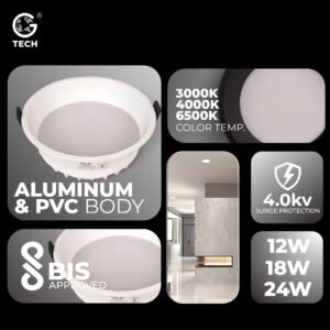 Enhance your interiors with the G TECH LED Downlighter, engineered for superior energy efficiency and long-term reliability. Combining modern design with advanced material engineering, this round ceiling light fits flush in any setting—homes, offices, retail, or hospitality—delivering glare-free, visually comfortable illumination with a low-profile aesthetic.