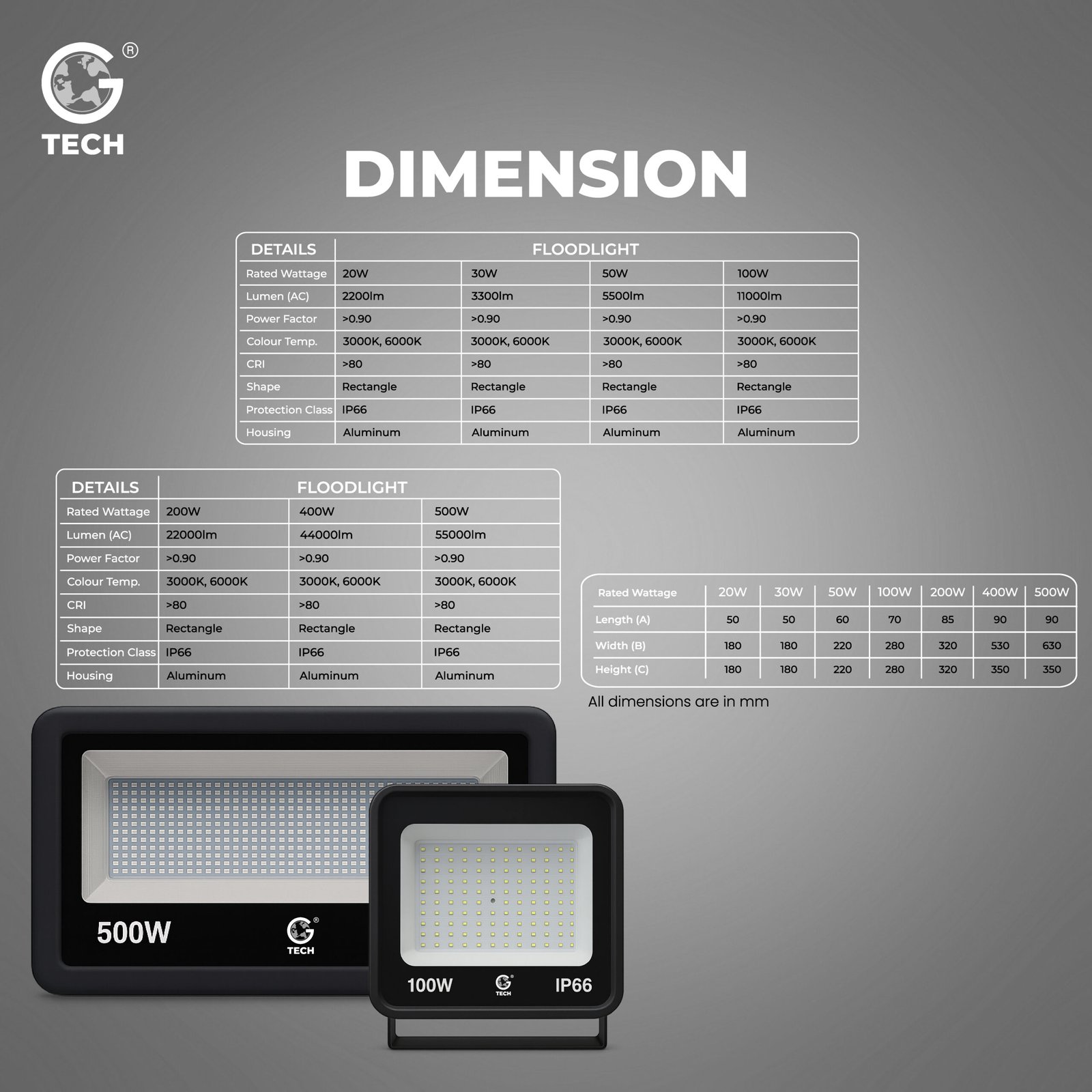 Superior LED technology with outputs ranging from 2200lm (20W) to a powerful 55,000lm (500W)